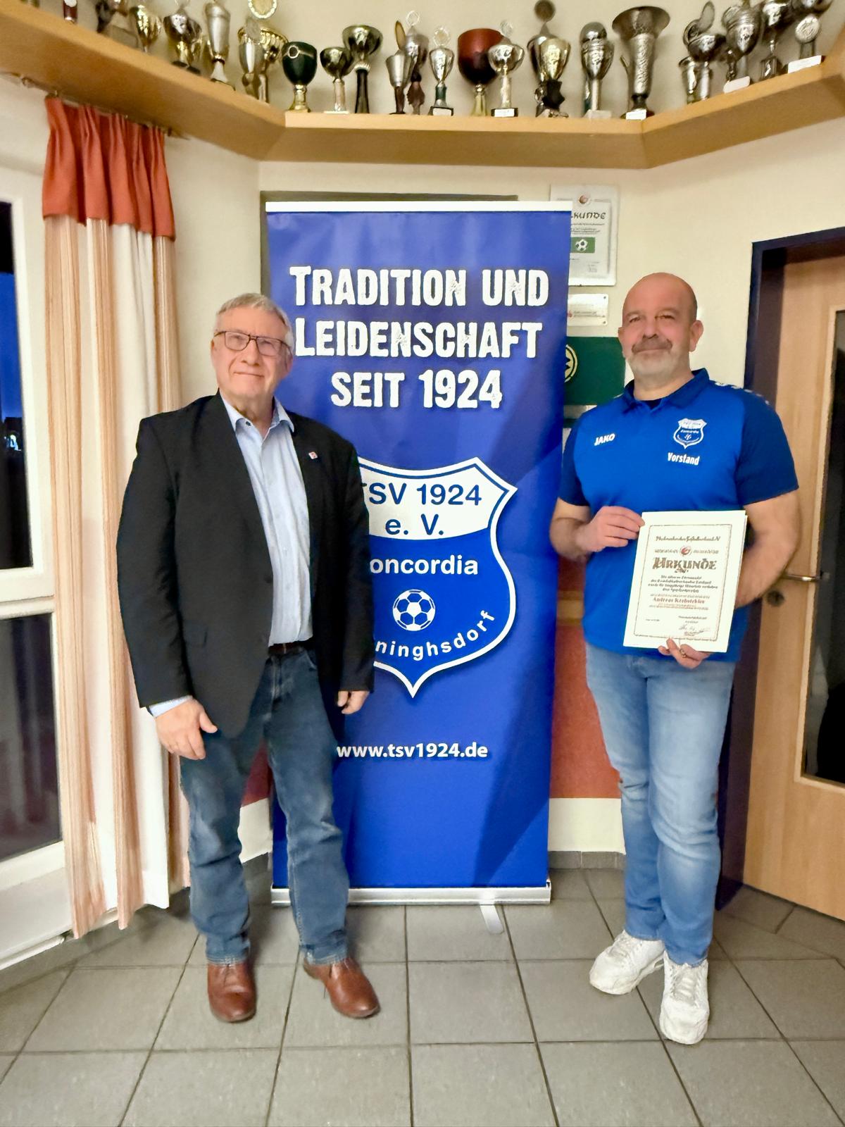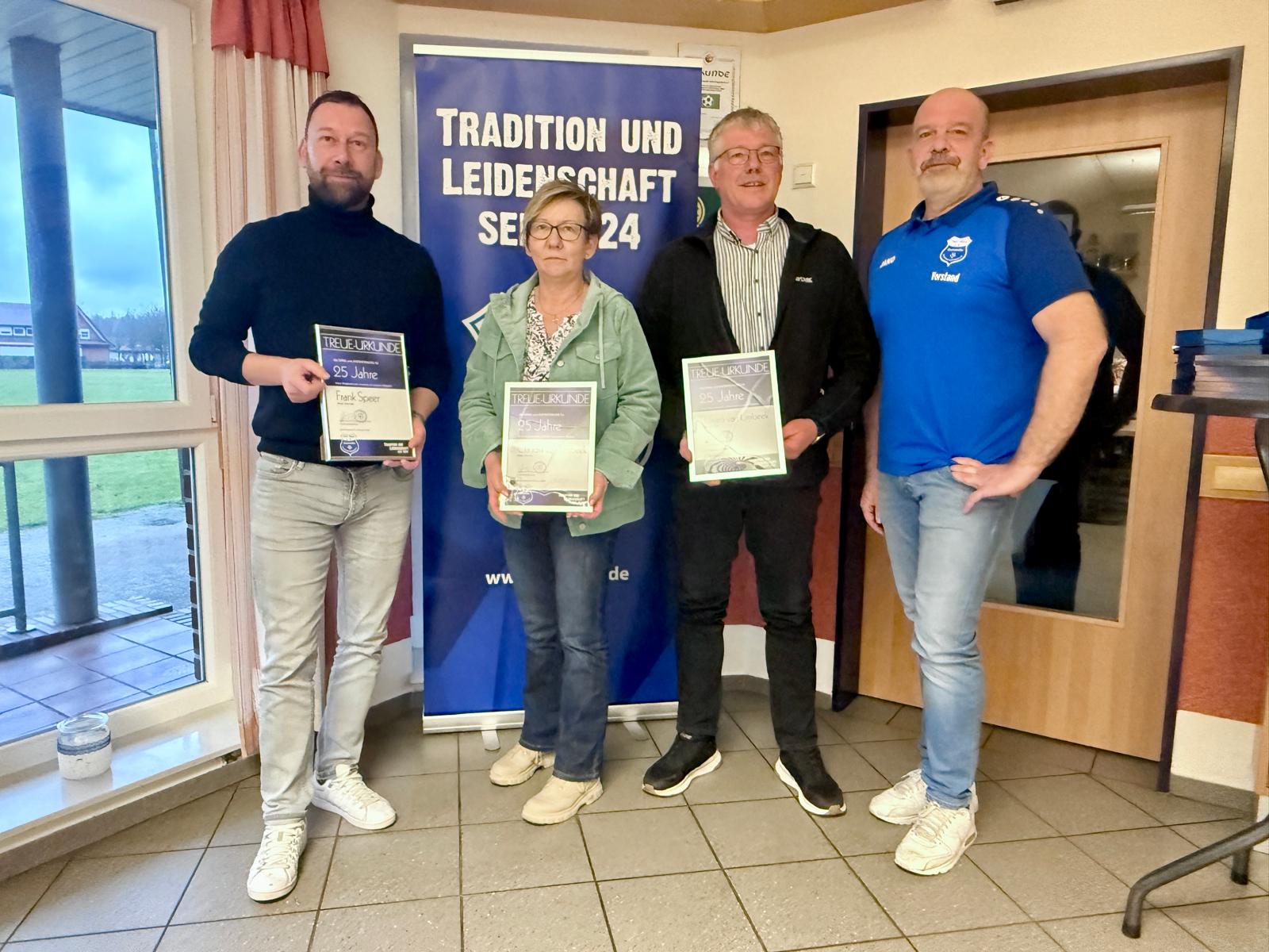 Im Rahmen der diesjährigen Generalversammlung haben wir unseren 1. Vorstandssprecher Andreas Krebstekies, der unseren Verein vier Jahre lang mit großem Engagement geführt hat, aus seinem Amt verabschiedet. Andreas hat seine Position aus persönlichen Gründen zur Verfügung gestellt. Wir bedanken uns herzlich für seinen unermüdlichen Einsatz, seine wertvolle Arbeit und die freundschaftliche sowie erfolgreiche Zusammenarbeit der vergangenen Jahre. Auch der Kreisfußballverband ehrte Krebstekies für seine langjährigen Verdienste um den Fußballsport mit der silbernen Ehrennadel. Heinz-Gerd Evers, Vorsitzender des Kreisfußballverbandes, würdigte seine Leistungen und nahm die Auszeichnung im Rahmen der Generalversammlung vor.